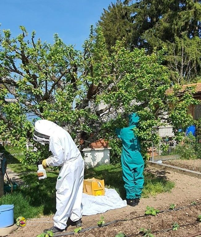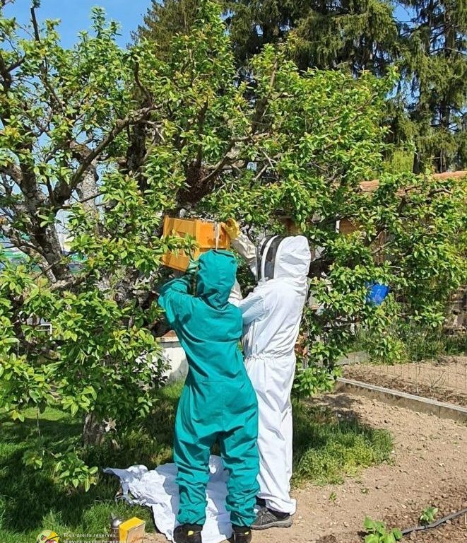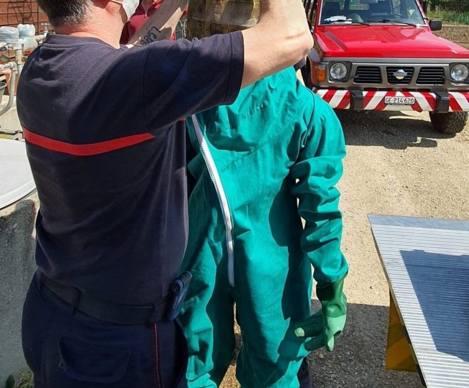 Aux alentours de 14h00, le Service du Feu de Meyrin est alarmé par la Centrale d’engagement pour la récupération d’un essaim d’abeilles. En arrivant sur place, le chef d’intervention prend contact avec les occupants et fait sa reconnaissance, les rassurent et leur demande de garder les distances avec l’essaim.